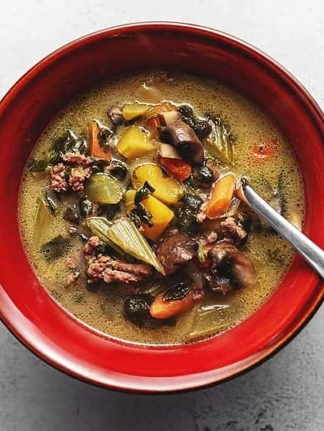 Add in the garlic, mushroom, and spinach. Cook for five more minutes. Add the ground beef back to the pot, followed by beef broth, beef bullion, and coconut milk.