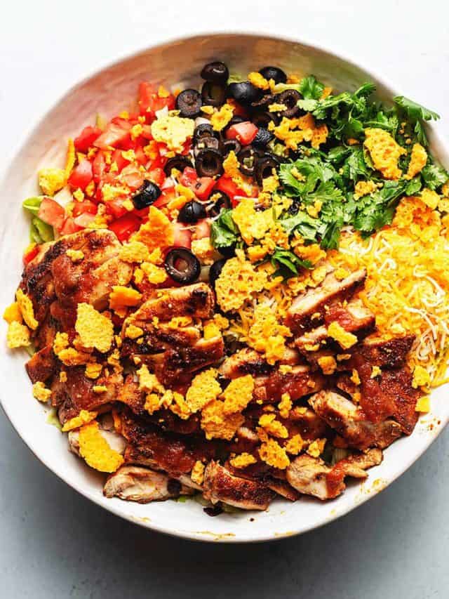 This easy, low carb friendly, flavorful, recipe is layered with chicken or beef, lettuce, cheese, olives, salsa, cilantro, and cheese chips!
