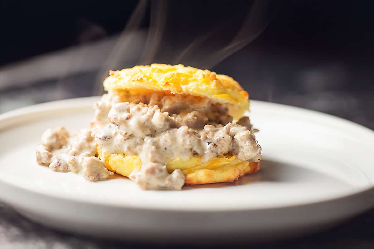Pre-heat oven to 400F. Line a baking pan with parchment, a silicone baking mat, or spray with cooking spray. Add all of the biscuit ingredients to a large bowl and stir to combine.