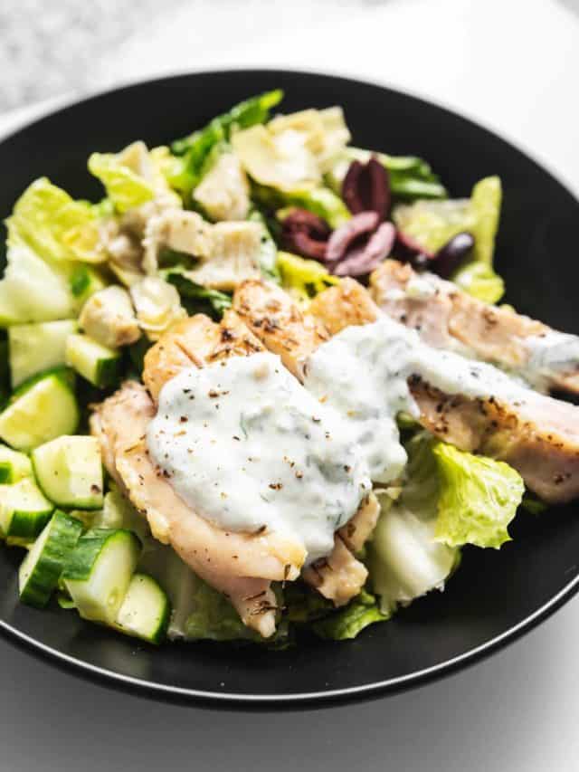 Divide the romaine between 4 salad bowls and drizzle with dressing. Top with the olives, artichoke hearts, and cucumber. Slice the prepared chicken into strips and layer on top of the lettuce, followed by a couple of spoonfuls of the tzatziki. Serve.
