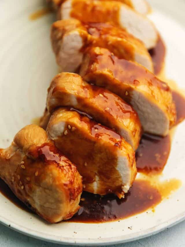 Place your pork tenderloin into the sauce and let marinade for 20 minutes, flipping halfway through. Remove from the marinade and place on the foil-lined baking sheet. Place the pork into the oven and bake for 20-30 minutes or until the internal temperature is 145F. Let rest for 10 minutes before slicing.